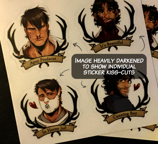Colorful 4x6" sticker sheet featuring Hannibal and Will! Printed on heavy-duty durable vinyl, each sticker is individually kiss-cut for easy removal. Each sticker is just under ~2x2" in size. 6 unique designs per sheet.
