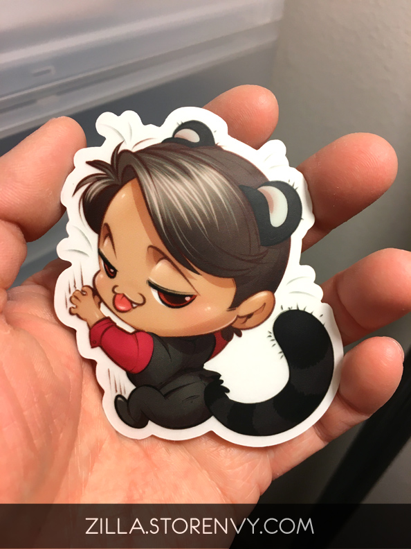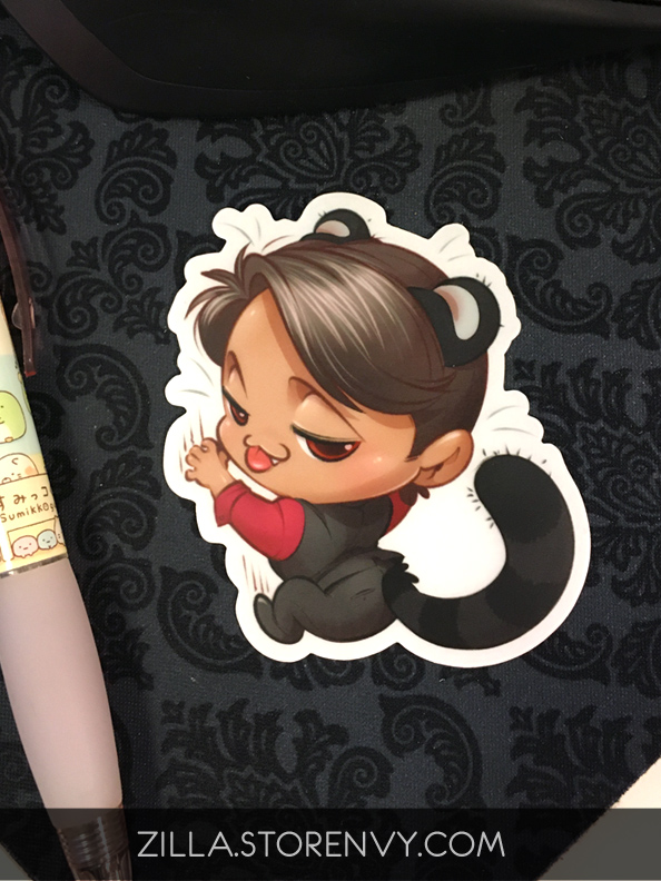 Super cute 3" clear vinyl decal featuring naughty chibi Hannicat doing what he does best; causing MAYHEM and clawing his way into the drapes of your heart <3