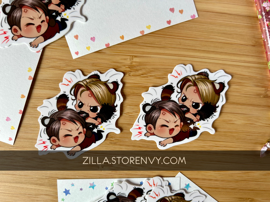 Colorful 2.5" sticker featuring chibi Hannibal and Nigel in mini tiger form having a feral little alpha fight!