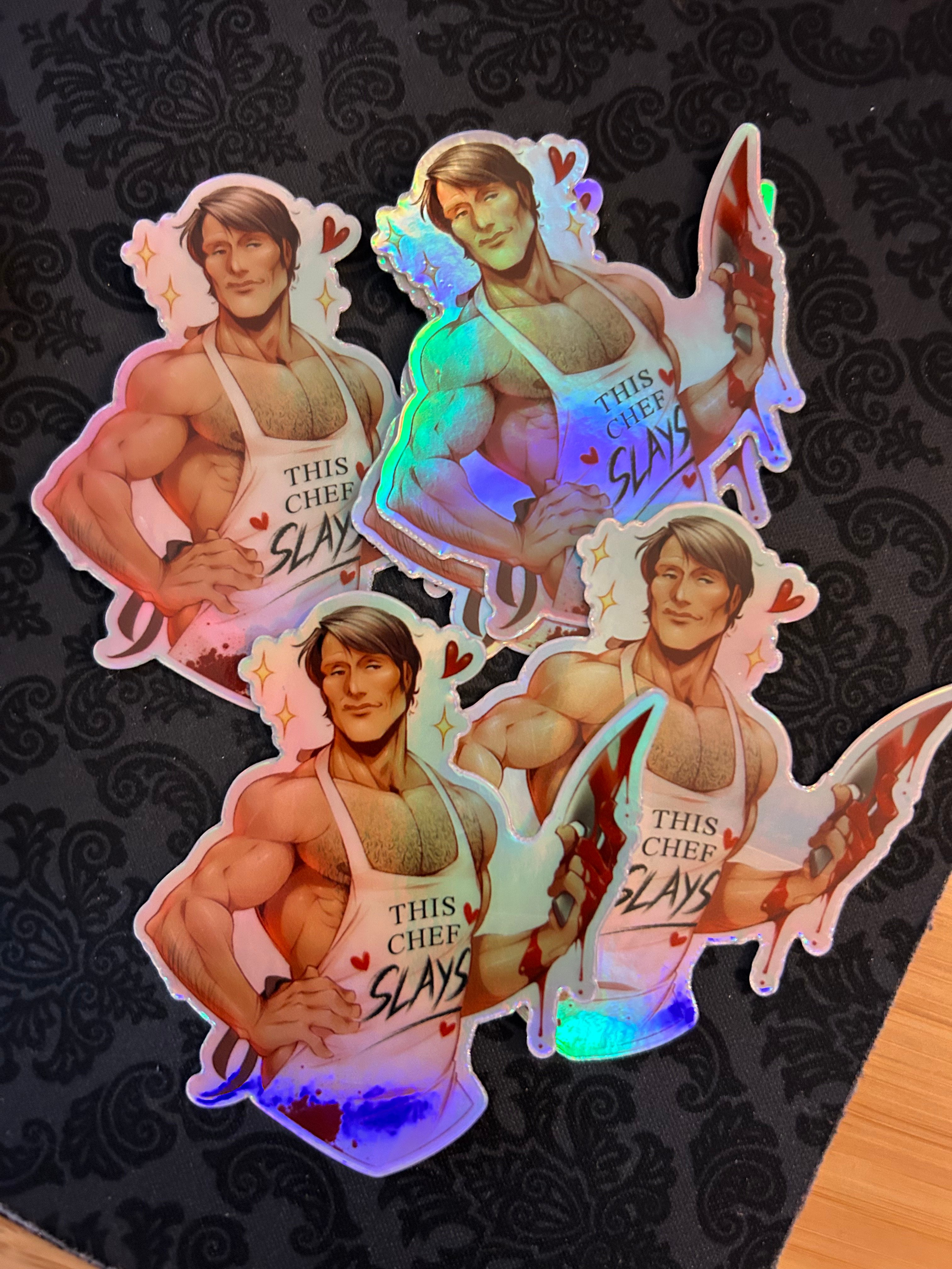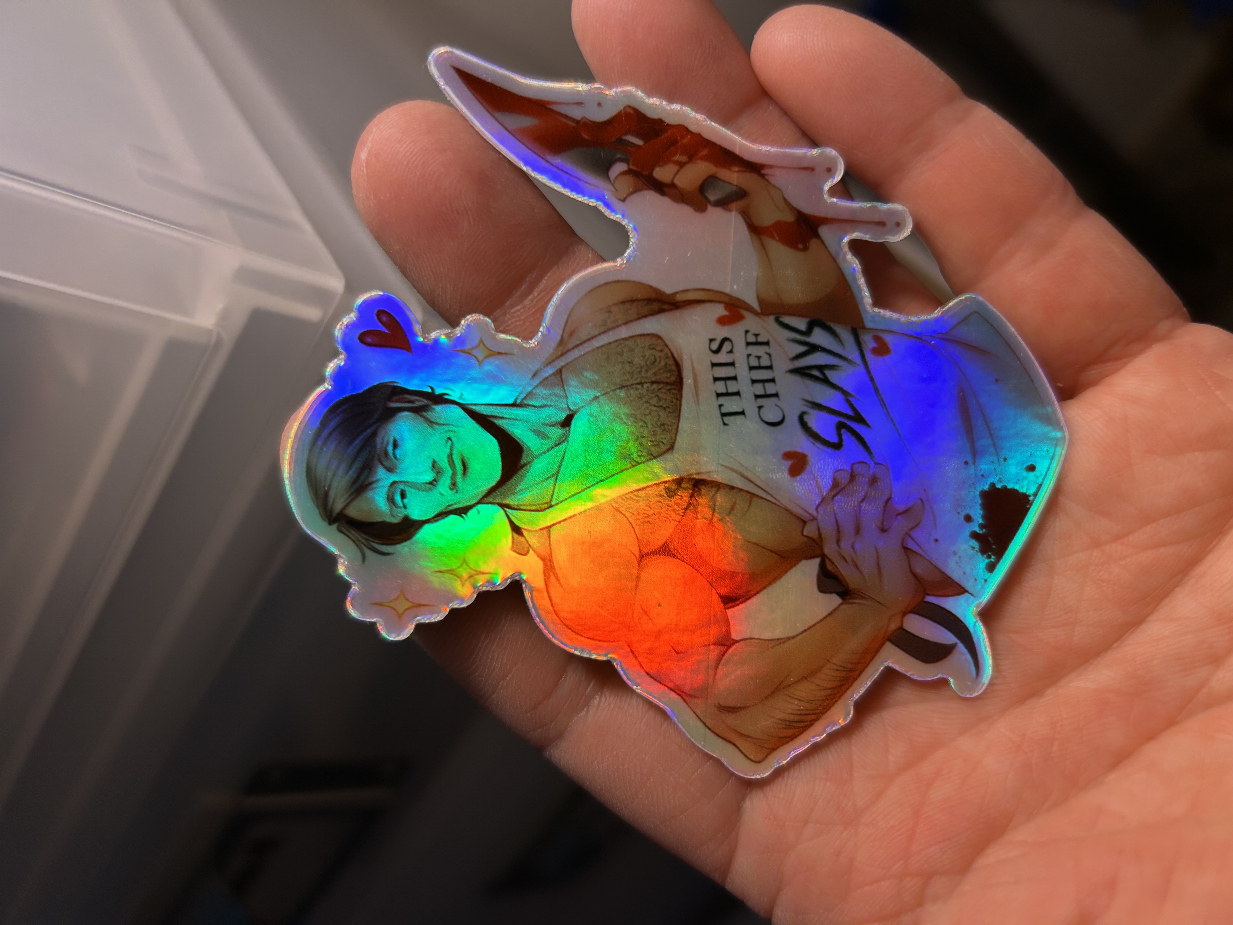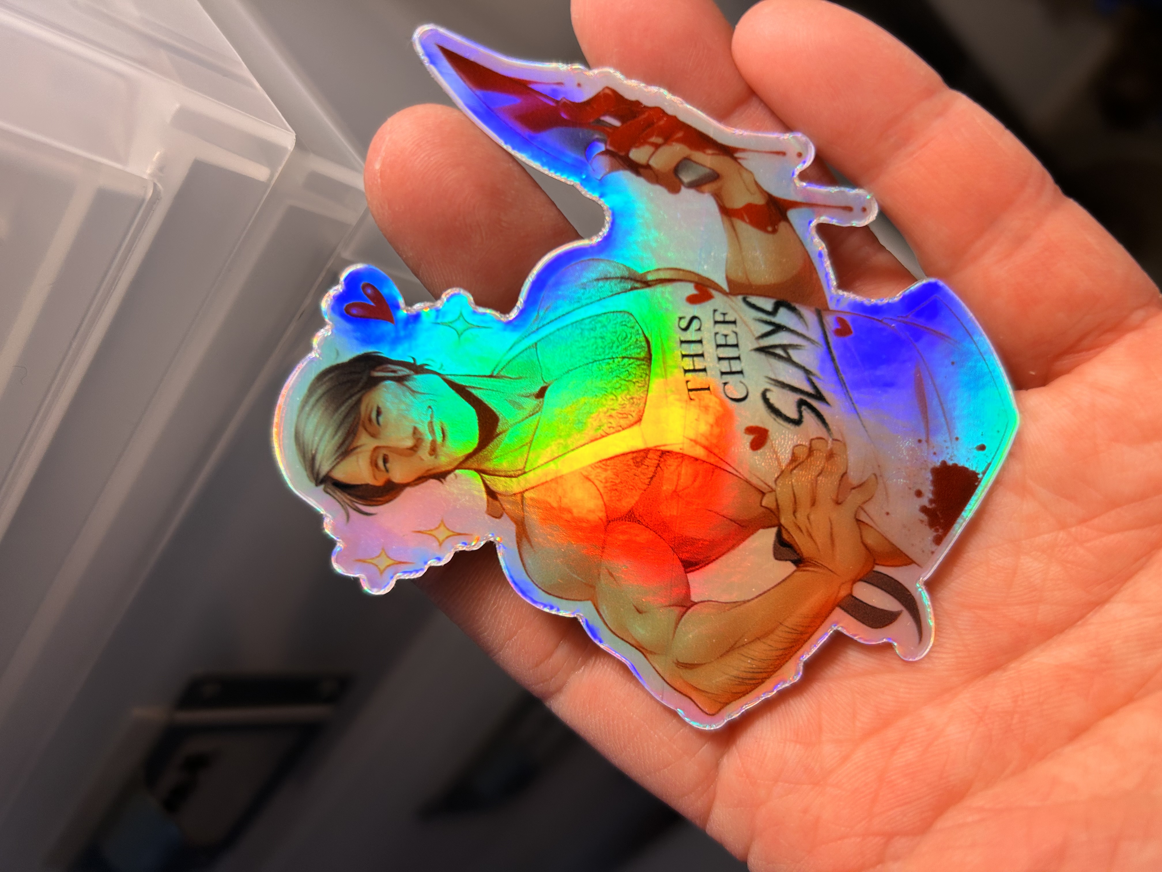 Colorful 3" holographic vinyl decal featuring our favorite killer chef! ;D
